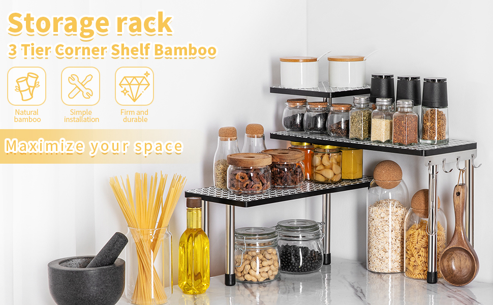 {SUITABLE FOR ALL KINDS OF DECORATION}:Free-standing shelves can be moved and placed in almost any location, including kitchen countertops, cabinets, pantry, and even other rooms in the house. It can be easily used for bathroom, cosmetics and seasoning tank storage, or for storing crafts and decorations.The versatile bamboo rack is an excellent solution for kitchen or home storage and organization.