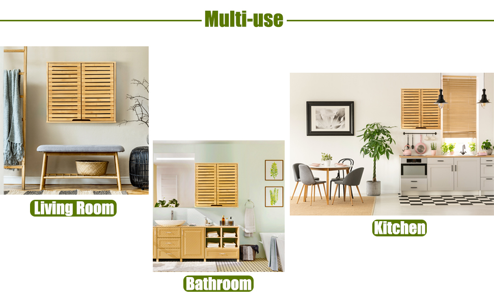 {2-tier Bathroom Wall Cabinet}:This 2-tier bamboo bathroom wall cabinet has an adjustable shelf which provides ample space for organizing and displaying your towels, shampoos, toilet papers, etc. It designed with 2 doors, and you can open it easily with the bottom slot.