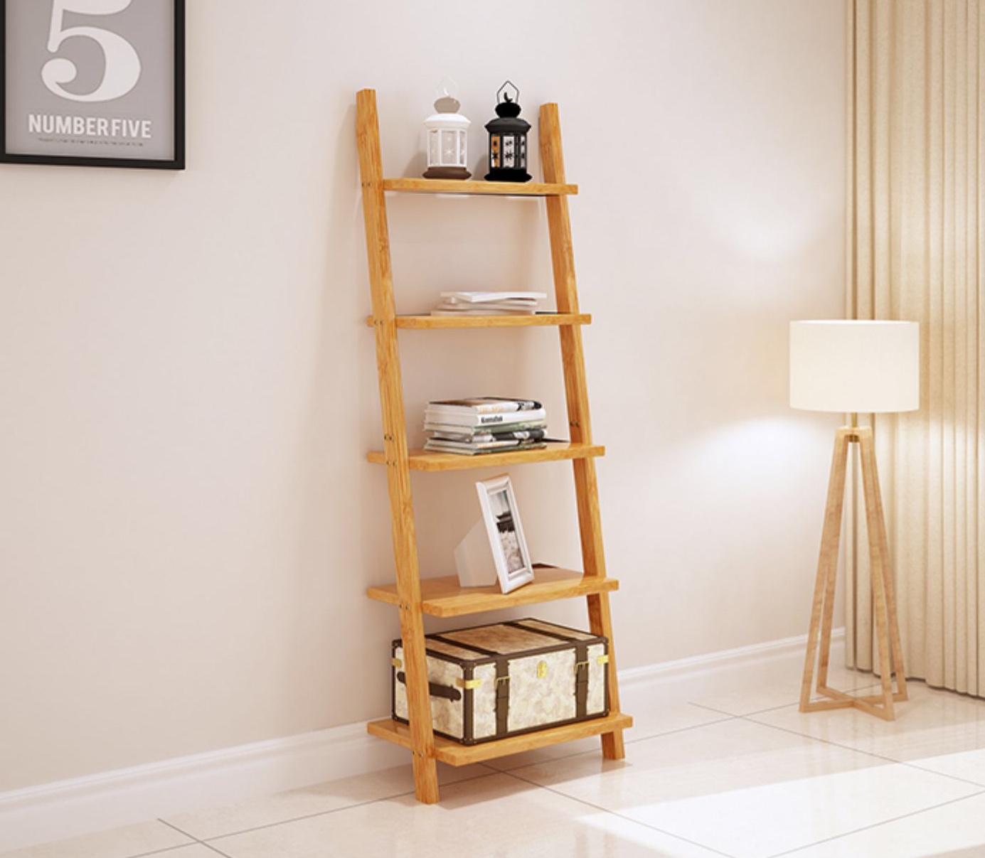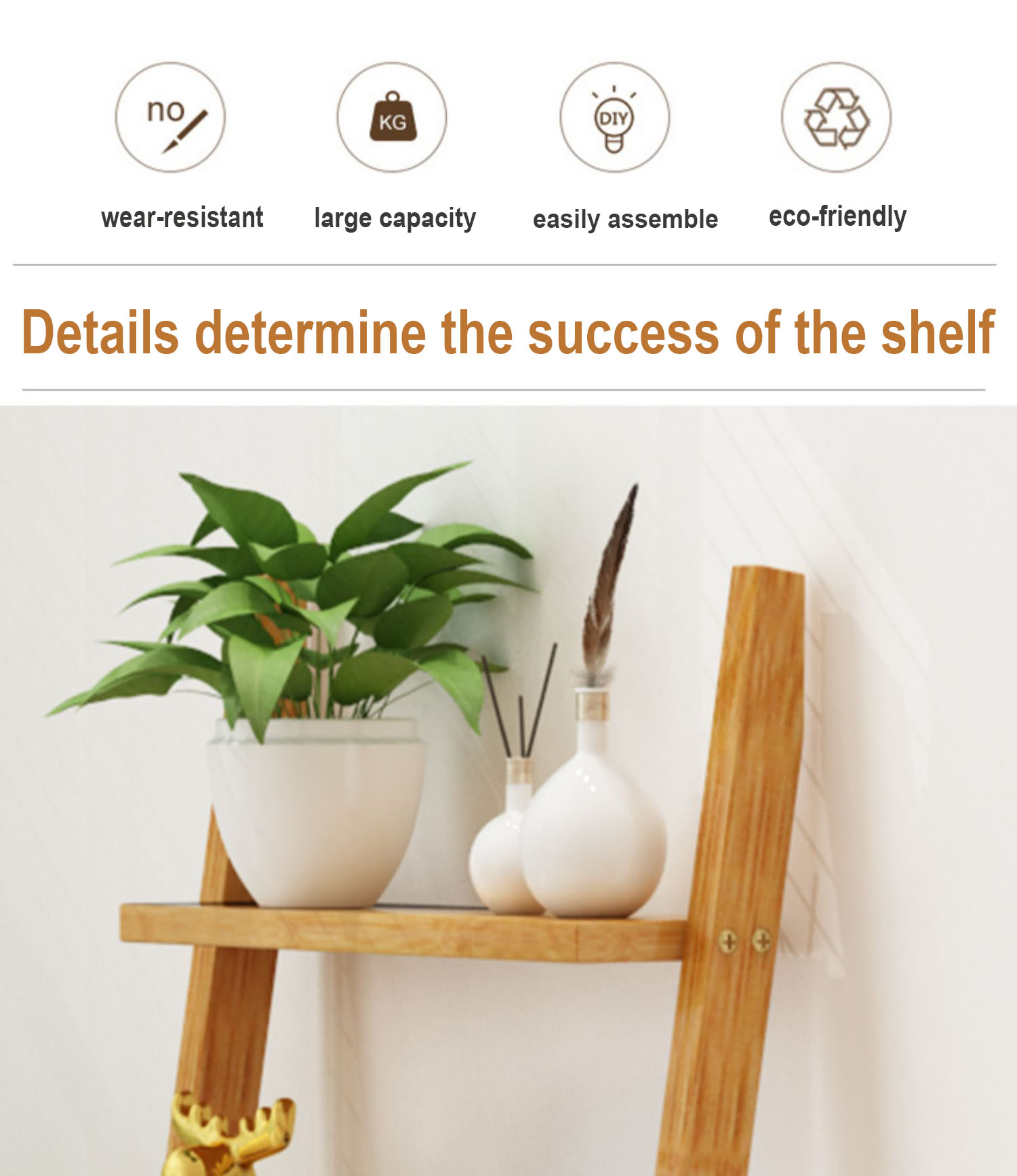 {Eco-Friendly Material}HYNAWIN leaning shelf is made of high-quality bamboo material , free of harmful chemicals and peculiar smell. eco-friendly varnish is made of environmental protection material, which is harmless to human body. Therefore, it is of high quality, durability, loadability, robustness and practicability.
