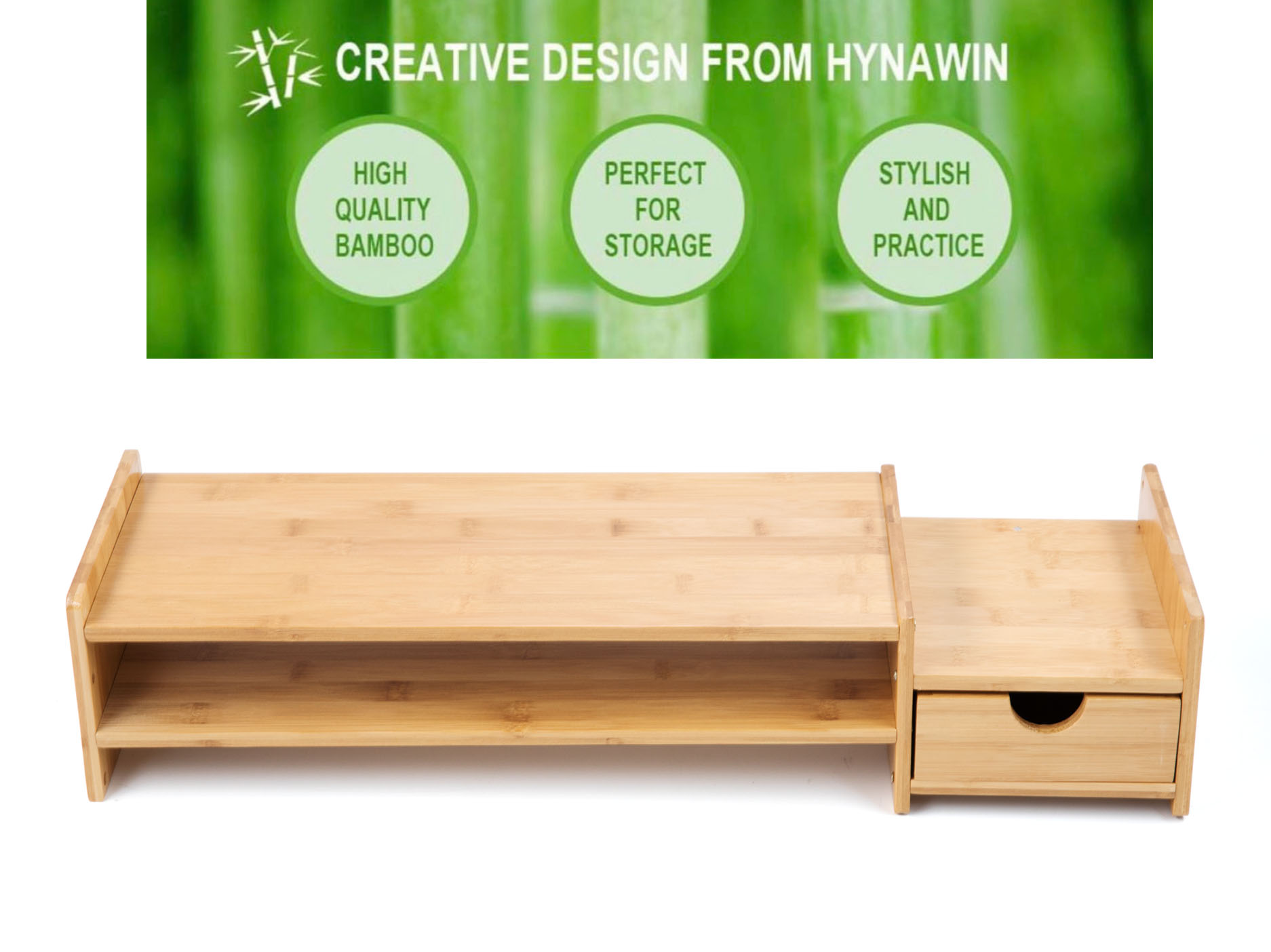 {Convenient Storage}:You can lift your monitor by the 1 tier stand shelf and store your keyboard underneath it.A cellphone holder, one drawer and a large compartment for utility stuff in position to increases your desk space.